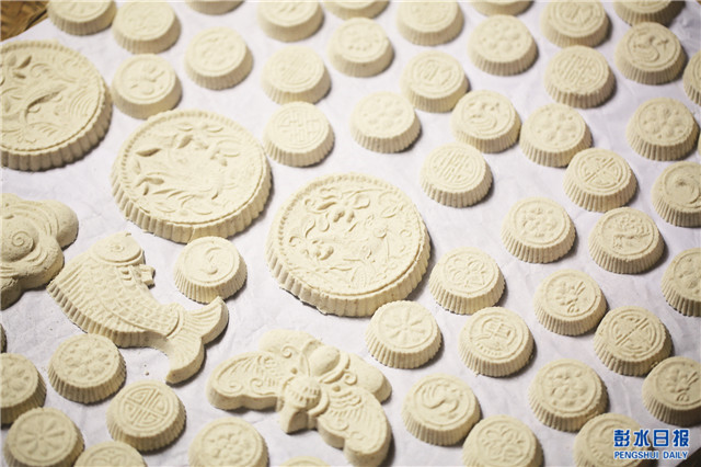 9月14日,在郁山鎮戴記食品工廠里,工人們正在搟酥、包餡、上芝、烘烤,準備制作傳統的手工搟酥餅。