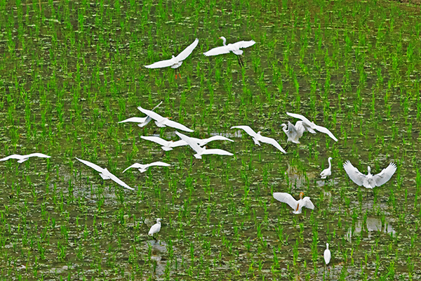 近日,在諸佛鄉復興村的的一片稻田里,前來覓食的白鷺在稻田上空展翅飛翔,鳥兒潔白的羽毛與碧綠的秧苗相映成趣,構成一幅天然的山村畫卷。近年來,越來越好的生態環境為各種鳥類提供了良好的棲居條件,生動展示了我縣加大生態環境保護,促進綠色發展的實際成效。