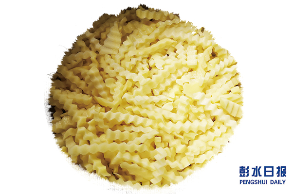 洋芋花形狀并不是真做成花狀,而是用波浪形的特制刀具將洋芋切成波浪形的小條,因為和薯條的直條有區(qū)別,所以美其名曰"洋芋花"。油炸后加上調(diào)料,因其香辣可口的味道被收入進(jìn)《苗鄉(xiāng)菜譜》,伴隨著彭水人成長。
