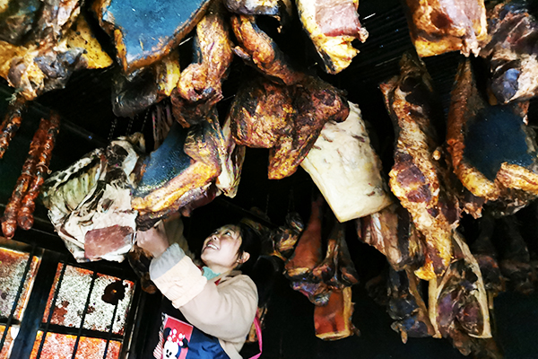 中國彭水網(融媒體記者 陳興盛 攝影)近日,梅子埡鎮佛山村村民張梅在掛臘肉。春節將至,又到臘肉飄香時,各地群眾趕制臘肉、臘腸等臘味,備年貨迎接新年。