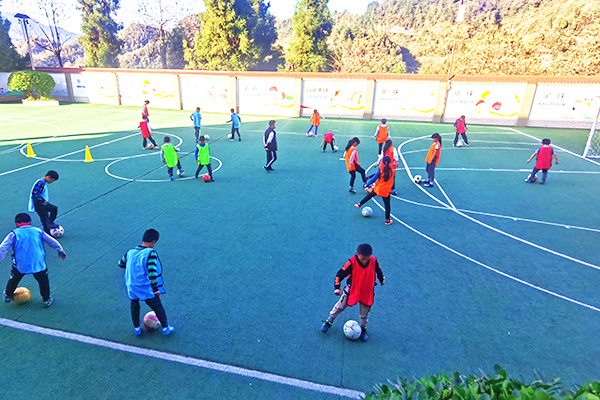 記者來(lái)到朗溪鄉(xiāng)中心校時(shí),體育教師正帶著孩子們上“四點(diǎn)半課堂”的足球課。三層教學(xué)樓前,孩子們分組練習(xí)帶球過(guò)樁,有模有樣。左轉(zhuǎn)爬上幾十級(jí)臺(tái)階,標(biāo)準(zhǔn)化塑膠籃球場(chǎng)呈現(xiàn)眼前。在山區(qū),平地比水源還金貴。為了建運(yùn)動(dòng)場(chǎng),學(xué)校硬生生在山坡上“造”出一小塊平地。