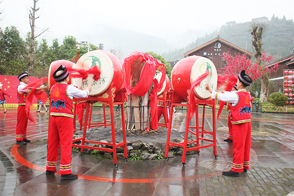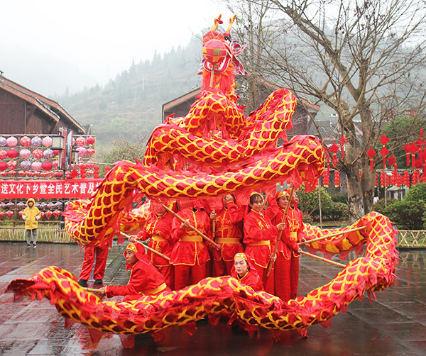活動現場,一時鑼鼓喧天,只見一名表演者牽牛、兩名表演者玩牛,兩個人將栩栩如生的黑牛道具披在身上,在牽牛人的逗弄下,時而發怒、時而撒歡、時而老實;舞動的“雄獅”雙眼靈動,外形俊俏,大嘴張合有度,時而搖頭擺尾、昂首仰視,時而俯身匍匐,舞姿妙趣橫生;游動的“巨龍”也毫不遜色,蛟龍漫游、蛻皮、鉆節、追珠,一個個經典動作被舞龍者展現得淋漓盡致。期間,吹嗩吶、玩牛、烏江號子等傳統藝術表演博得現場觀眾拍手叫絕。