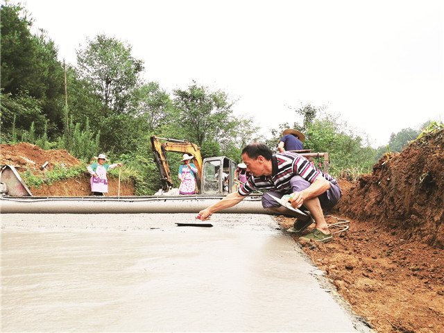 7月20日,在靛水街道桂花村6組,工人們正搶抓天時,有序進行公路硬化。