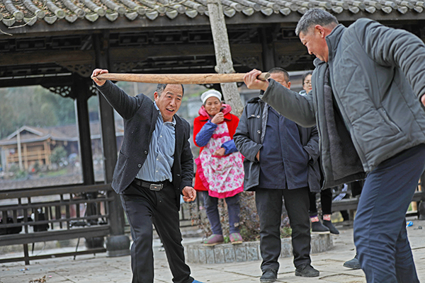 2月15日,鞍子鎮羅家坨村在羅家坨苗寨舉行趣味民俗活動,村民們相聚在一起,通過開展唱山歌、扭扁擔、踢毽子等活動,一起歡度元宵佳節。