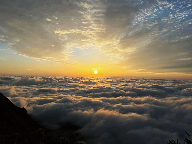 7月28日,雨過天晴,摩圍山出現大面積的云海奇觀,旭日躍然于連綿云海之上,形成一幅美麗的油畫。