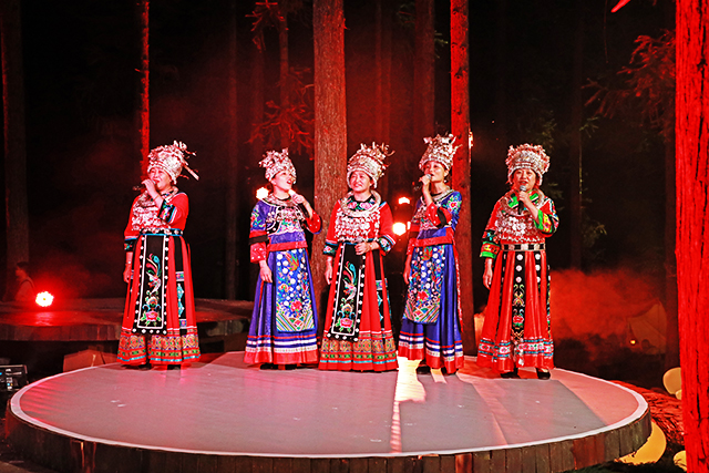 圓形舞臺掩映在郁郁蔥蔥的林間,在紅色、紫色、藍色等燈光的映襯下變得如夢如幻,觀眾散布在林中觀看演出。