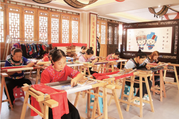 近年來,我縣積極開展苗繡技藝培訓(xùn),傳承苗繡技藝,開發(fā)苗繡文創(chuàng)產(chǎn)品,有效帶動村民就業(yè)增收,助推文旅融合發(fā)展。圖為8月20日,在彭水榮玉苗家刺繡工藝品開發(fā)有限公司苗繡非遺工坊,繡娘正在繡制新作品。