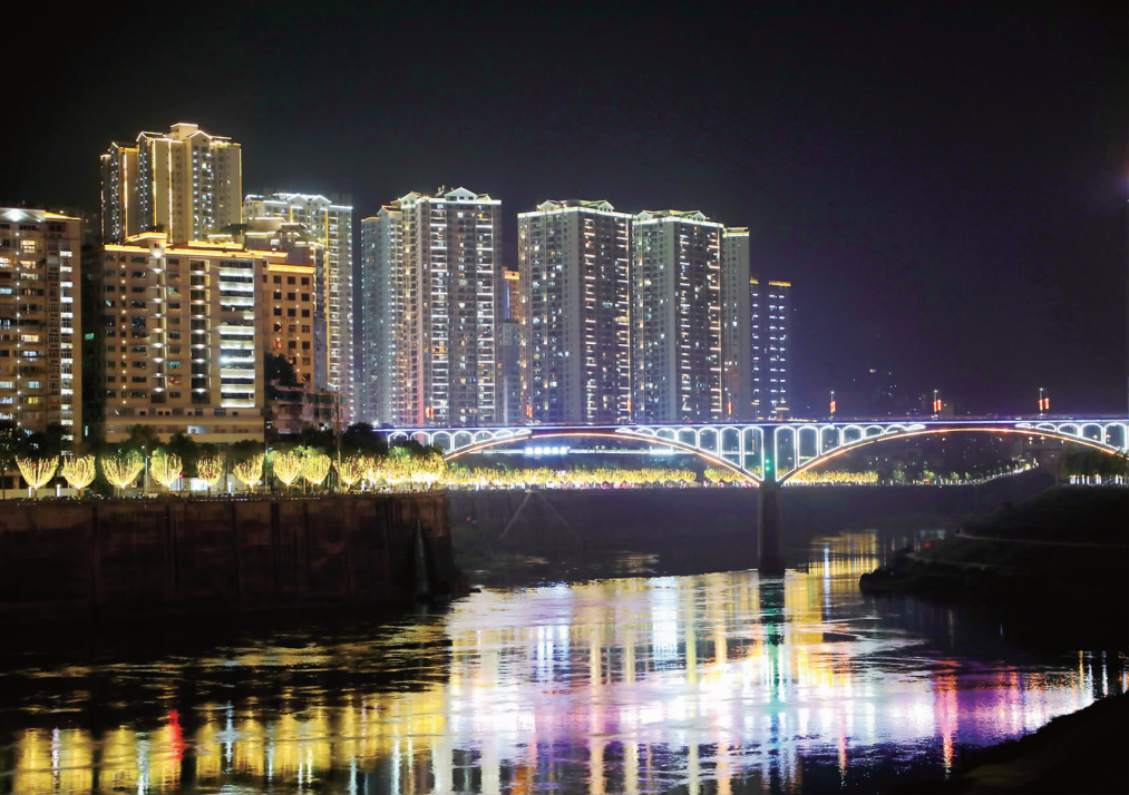 (記者 李紹標 攝影)夜幕降臨,彭水老城兩江四岸燈光璀璨,在五顏六色的燈飾映襯下顯得更加絢麗多彩,美輪美奐,讓人陶醉。圖為老城夜景一角。