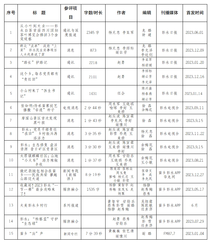 根據重慶市新聞工作者協會《關于開展第 26 屆重慶新聞獎(2024年度)評選工作的通知》文件要求,彭水苗族土家族自治縣融媒體中心對所屬各平臺報送的作品進行初評,擬報送15件作品參加第26屆重慶新聞獎評選,并將參評作品公示5個工作日(3月11日至3月15日),如有異議,請在公示期間以實名方式向我單位反映。
