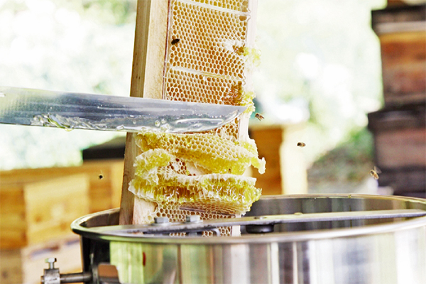 只見養蜂人戴著防護面罩,動作嫻熟地打開一個個蜂箱,蜂巢中滿是密密麻麻的蜜蜂,很多蜜蜂還圍繞蜂巢嗡嗡地飛舞著。養蜂人輕輕取出巢脾,上面掛滿了晶瑩剔透的蜂蜜,在陽光的照耀下,宛如一顆顆璀璨的黃金。隨著割蜜刀的輕輕劃過,香甜醇厚的蜂蜜緩緩流出,那濃郁的香氣瞬間彌漫在空氣中,讓人垂涎欲滴。
