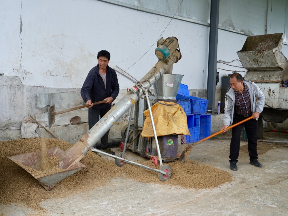 何文忠等村干部經過多方考察,再結合村里的實際情況,決定引進機器,將蔬菜邊角料加工成魚飼料,在村里發展生態魚養殖。